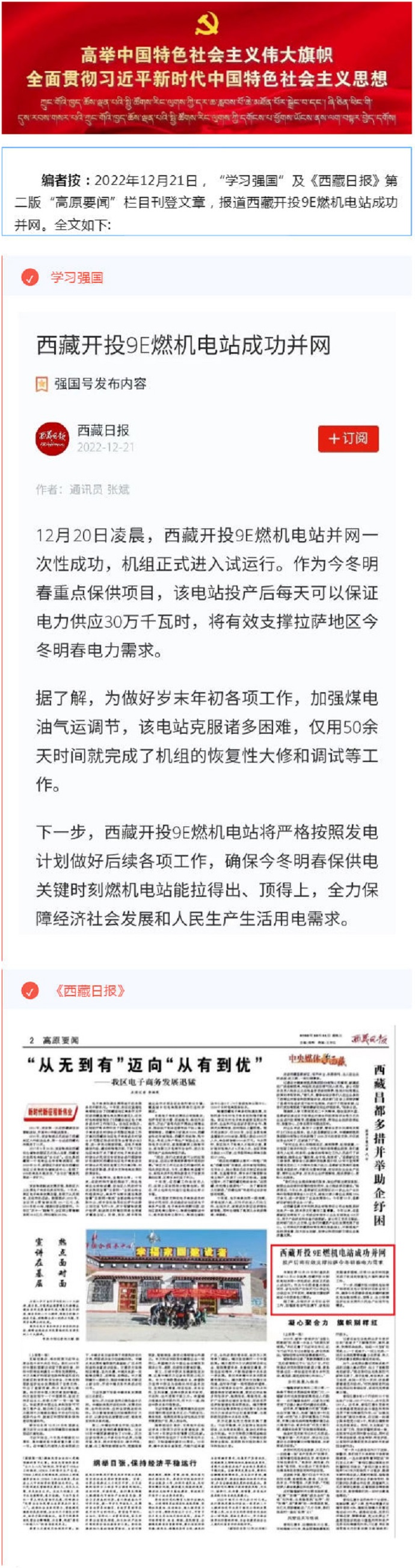 “學(xué)習(xí)強(qiáng)國”、《西藏日報》報道西藏開投9E燃機(jī)電站成功并網(wǎng)