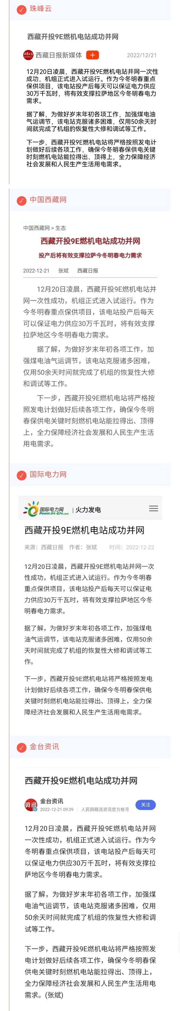 西藏衛(wèi)視(西藏新聞聯(lián)播)、珠峰云、中國西藏網、國際電力網及金臺資訊等媒體報道西藏開投9E燃機電站成功并網