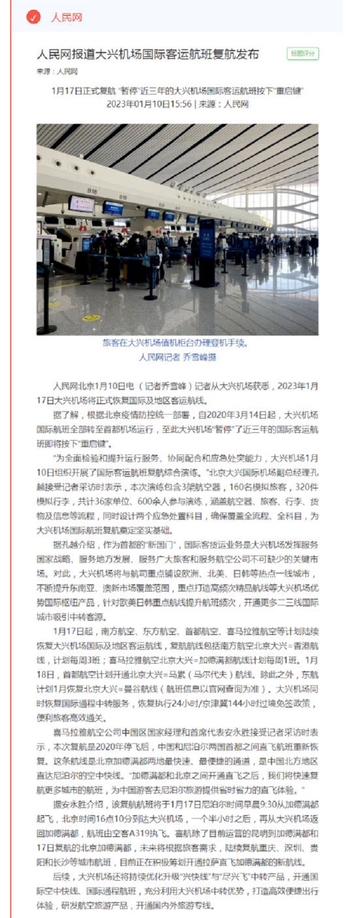 人民網(wǎng)報道大興機場國際客運航班復(fù)航發(fā)布會