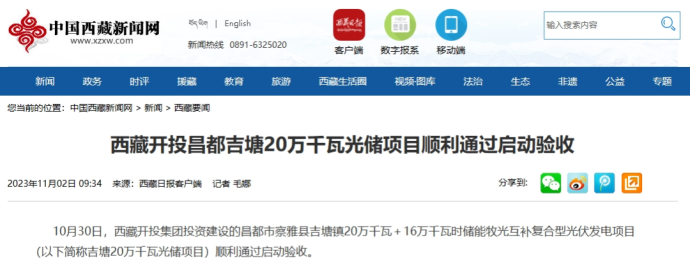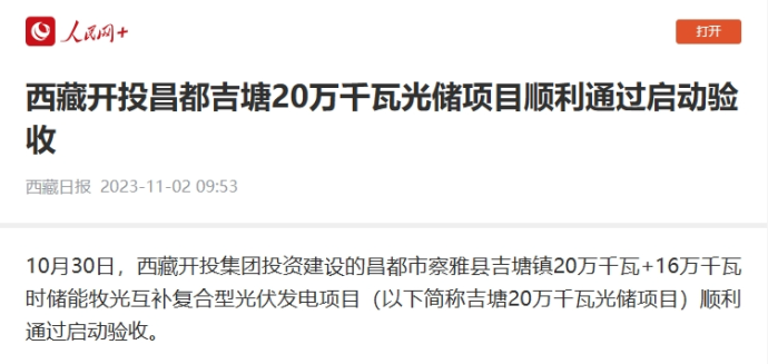 人民網(wǎng)、中國西藏新聞網(wǎng)、西藏日報客戶端報道了《西藏開投昌都吉塘20萬千瓦光儲項目順利通過啟動驗收》