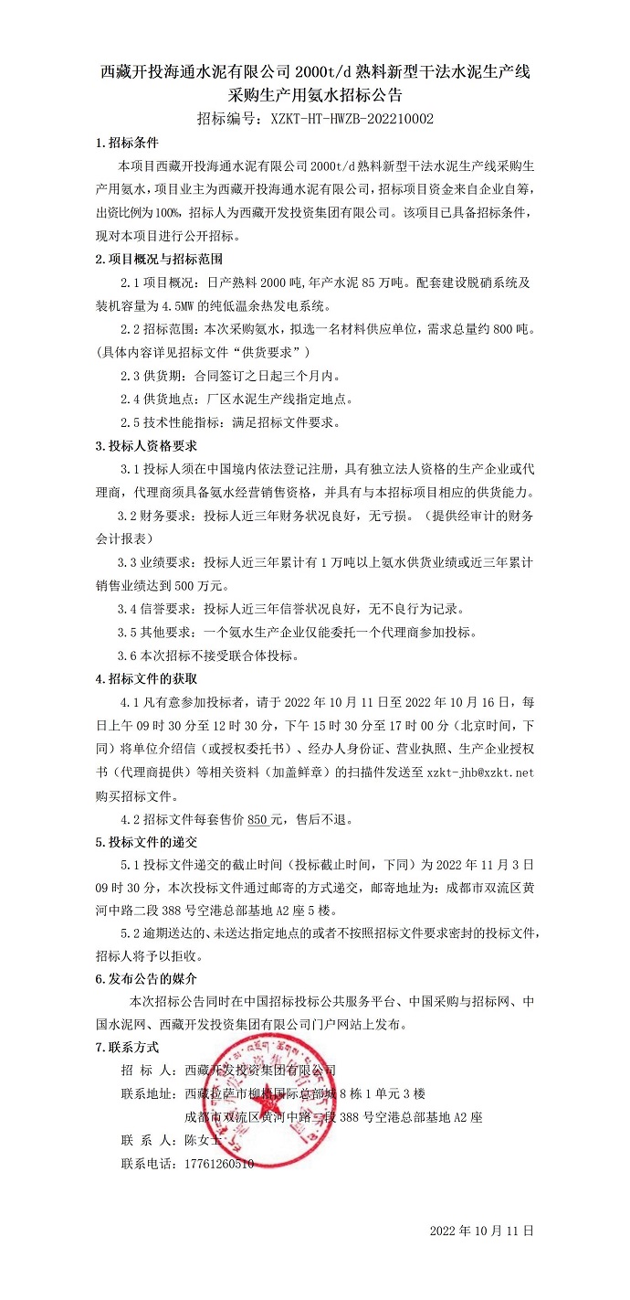 采購(gòu)生產(chǎn)用氨水招標(biāo)公告