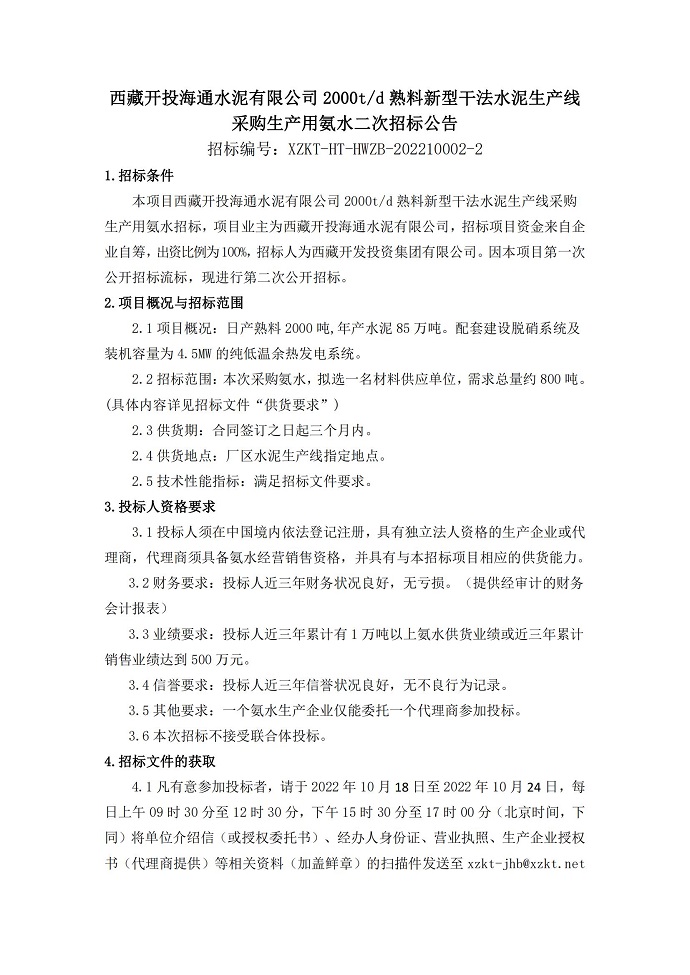 采購生產(chǎn)用氨水二次招標(biāo)公告