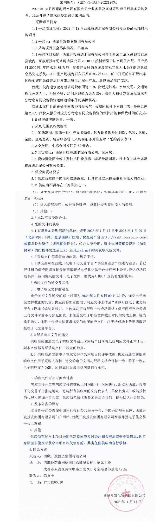 2022年12月西藏海通水泥有限公司專業(yè)備品及耗材采購項目詢價就采購公告