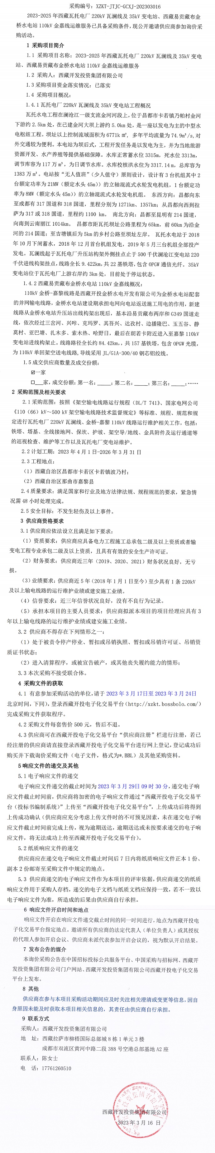 2023-2025年西藏瓦托電廠220kV 瓦瀾線及35kV變電站、西藏易貢藏布金橋水電站 110kV金嘉線運(yùn)維服務(wù)詢價采購公告