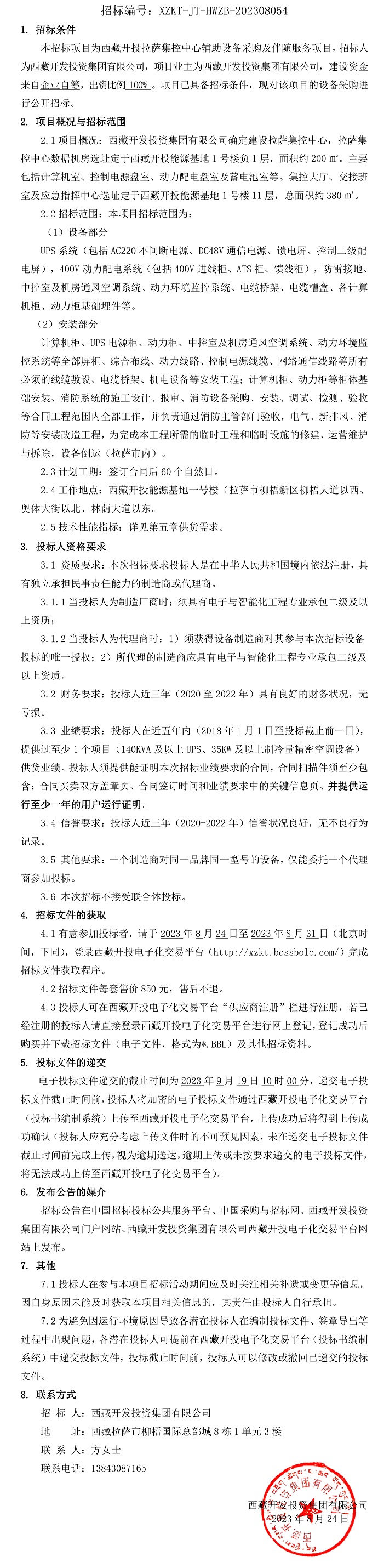 西藏開發(fā)投資集團(tuán)有限公司拉薩集控中心輔助設(shè)備采購(gòu)及伴隨服務(wù)項(xiàng)目招標(biāo)公告