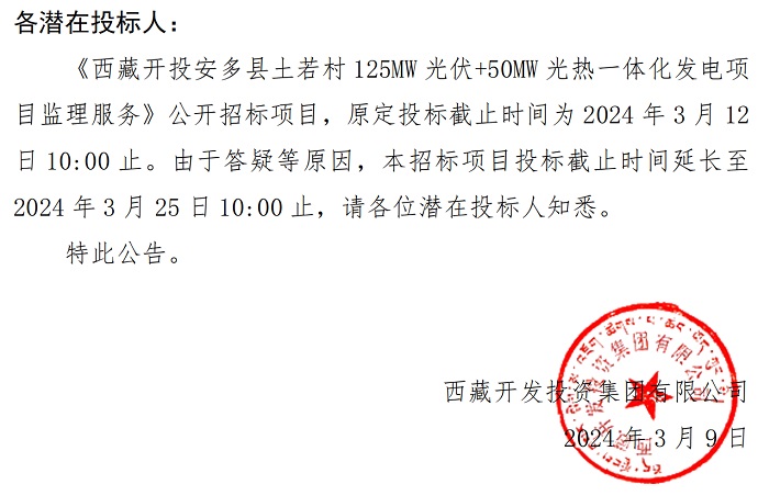 光熱一體化發(fā)電項(xiàng)目監(jiān)理服務(wù)》投標(biāo)截止時(shí)間的公告