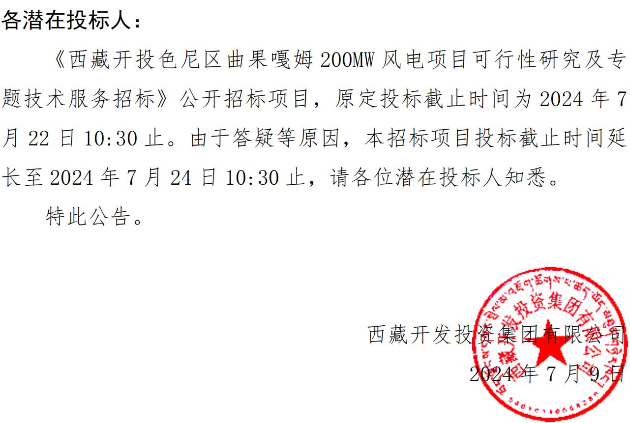 關(guān)于延長《西藏開投色尼區(qū)曲果嘎姆200MW風(fēng)電項目可行性研究及專題技術(shù)服務(wù)招標(biāo)》投標(biāo)截止時間的公告