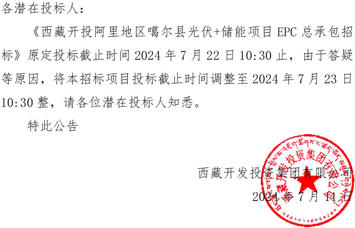 關于延長《西藏開投阿里地區(qū)噶爾縣光伏+儲 能項目 EPC 總承包招標》投標截止時間的公告