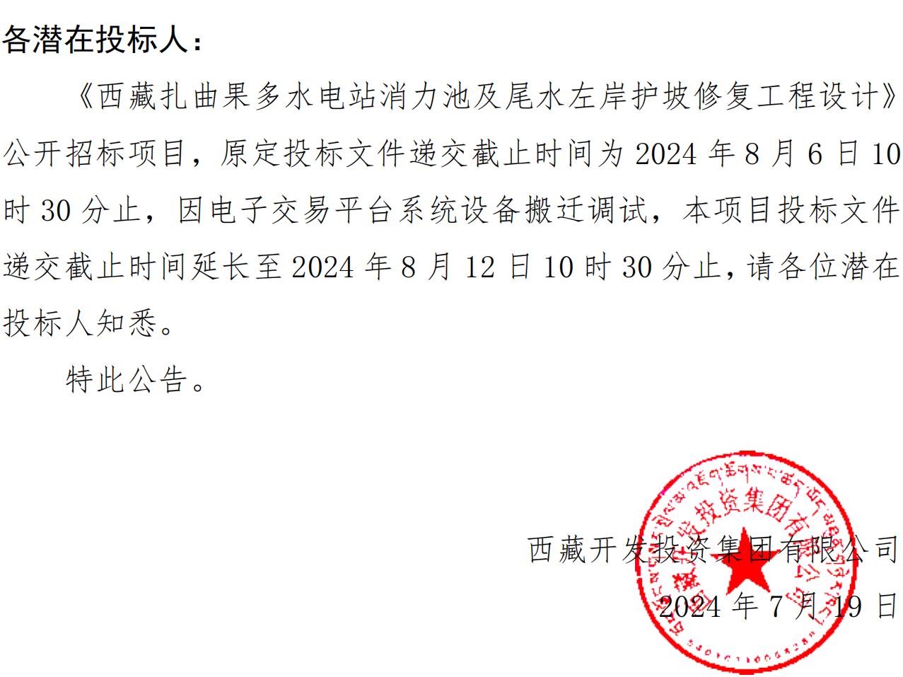 關(guān)于延長(zhǎng)《西藏扎曲果多水電站消力池及尾水左岸護(hù)坡修復(fù)工程設(shè)計(jì)》投標(biāo)文件遞交截止時(shí)間的公告