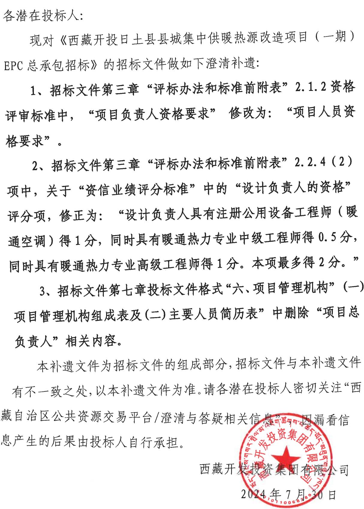 EPC總承包招標(biāo)補(bǔ)遺(01)號(hào)