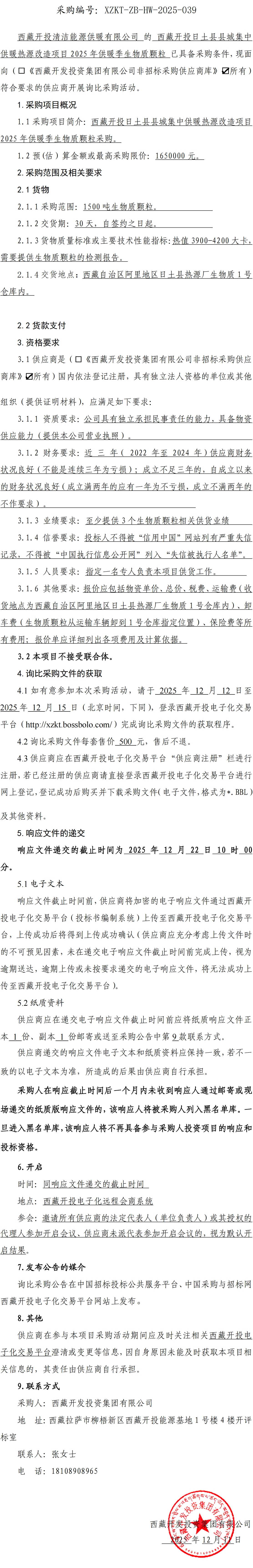 西藏開投日土縣縣城集中供暖熱源改造項(xiàng)目2025年供暖季生物質(zhì)顆粒詢比采購(gòu)公告