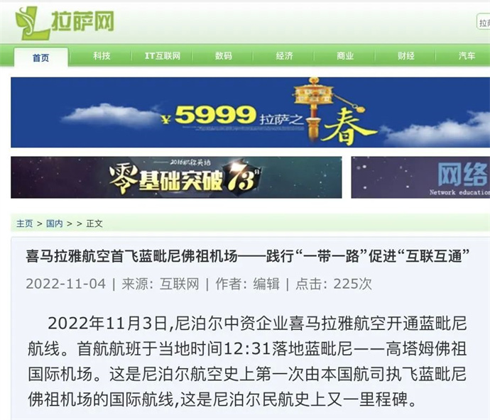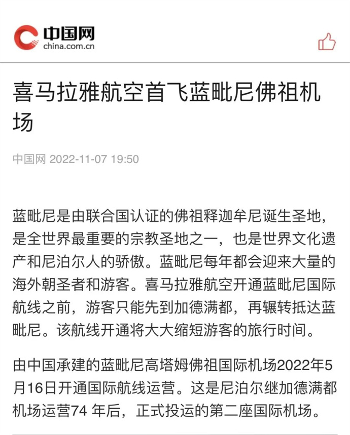 中華網(wǎng)、中國網(wǎng)、中企網(wǎng)、中國日報、光明日報、中國旅游新聞網(wǎng)、中國西藏新聞網(wǎng)、拉薩新聞網(wǎng)等媒體報道喜航開通加德滿都至藍(lán)毗尼航線