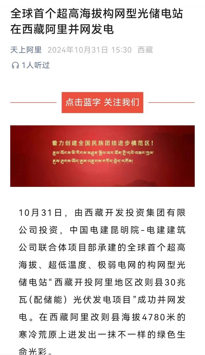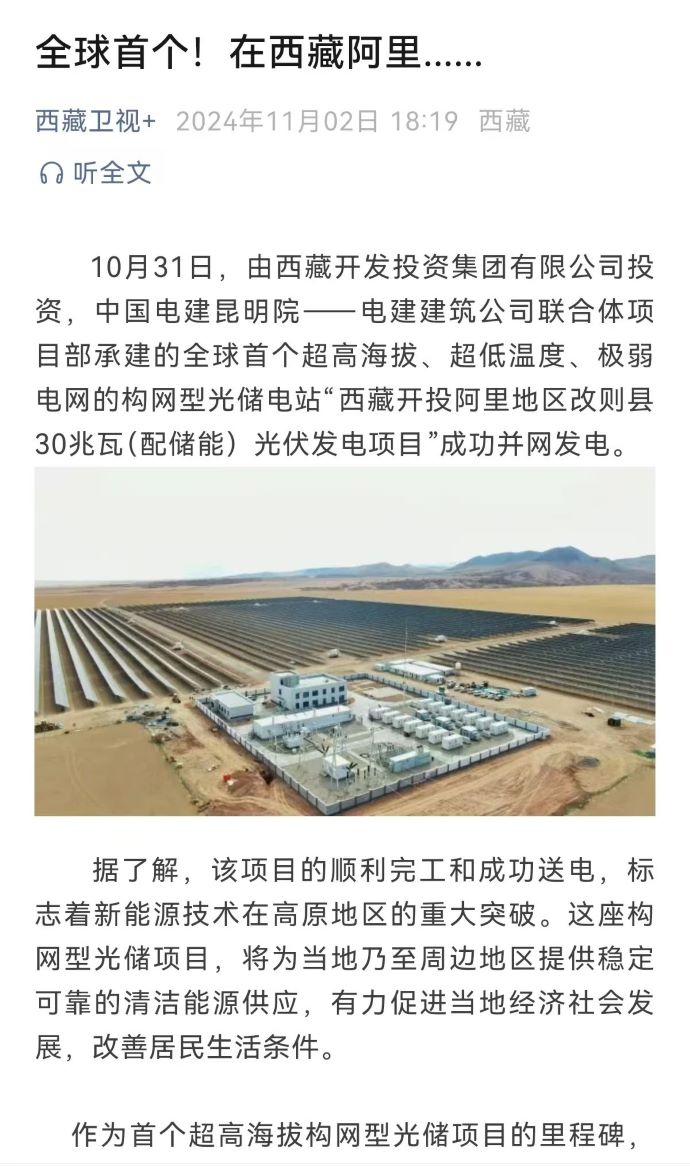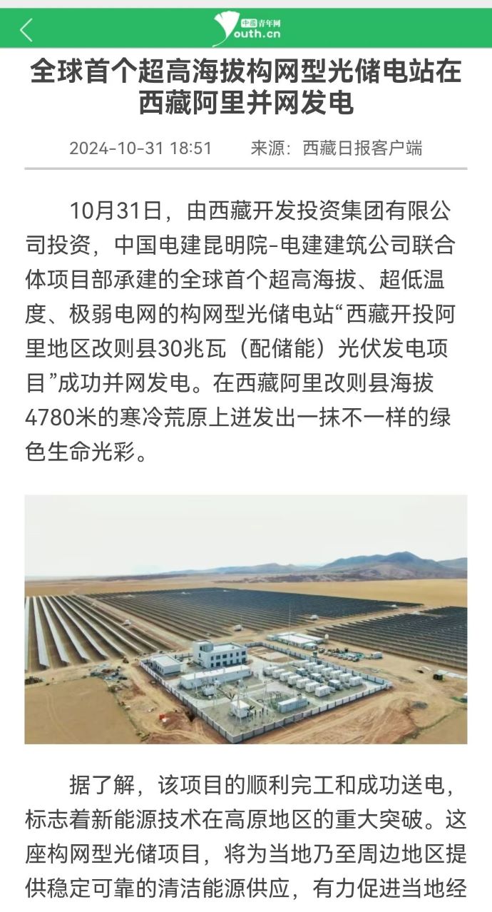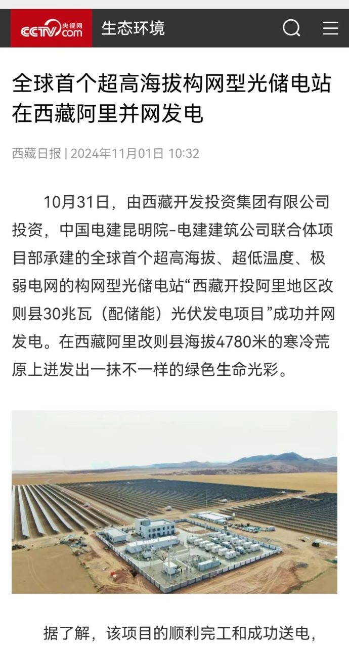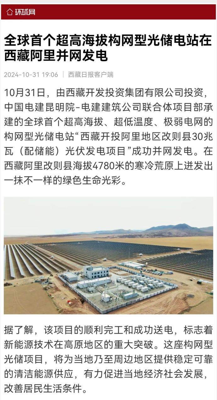媒體報道丨全球首個超高海拔構(gòu)網(wǎng)型光儲電站在西藏阿里并網(wǎng)發(fā)電