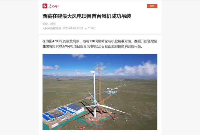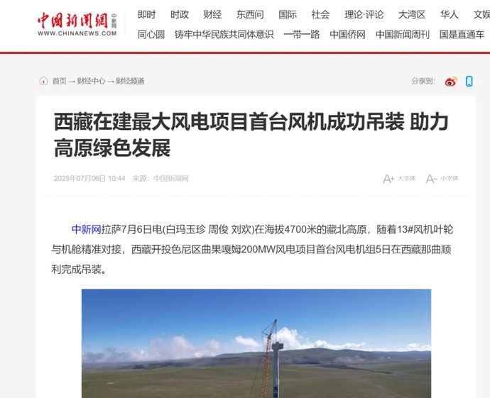 媒體報(bào)道丨西藏在建最大風(fēng)電項(xiàng)目完成首臺(tái)風(fēng)力發(fā)電機(jī)組吊裝