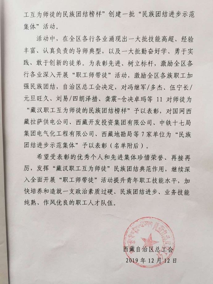西藏自治區(qū)總工會(huì)關(guān)于選樹一批"藏漢職工互為師徒的民族團(tuán)結(jié)榜樣"創(chuàng)建一批"民族團(tuán)結(jié)進(jìn)步示范集體"的表彰決定