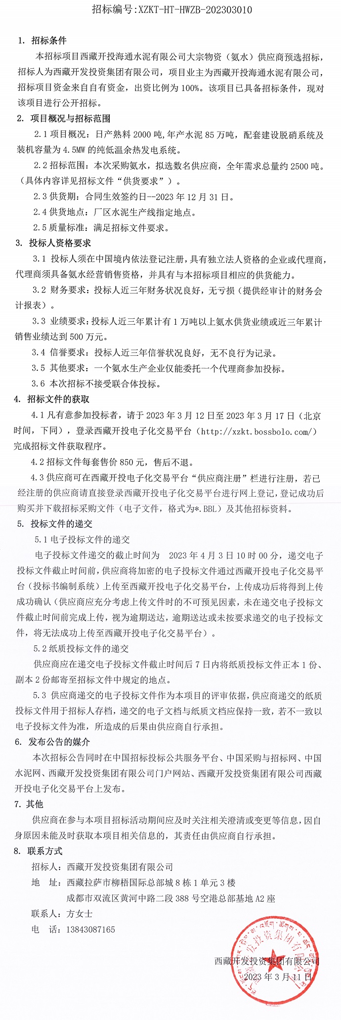 西藏開投海通水泥有限公司大宗物資(氨水)