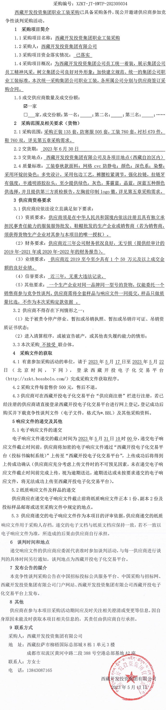 西藏開(kāi)發(fā)投資集團(tuán)職業(yè)工裝采購(gòu)競(jìng)爭(zhēng)性談判采購(gòu)公告