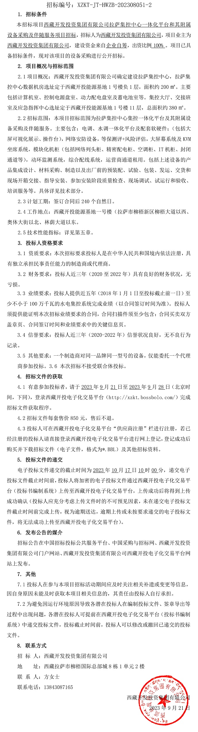 西藏開發(fā)投資集團(tuán)有限公司拉薩集控中心一體化平臺和其附屬設(shè)備采購及伴隨服務(wù)項目招標(biāo)公告(第二次)