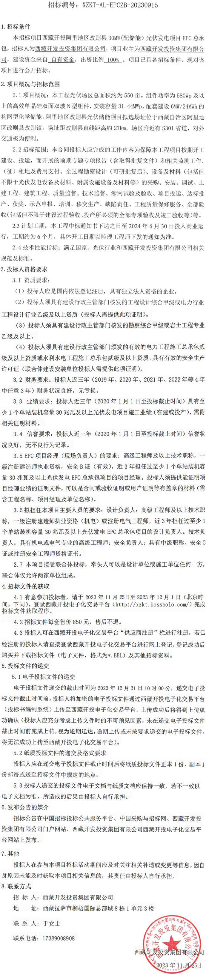 西藏開投阿里地區(qū)改則縣30MW(配儲能)光伏發(fā)電項目EPC總承包招標(biāo)公告