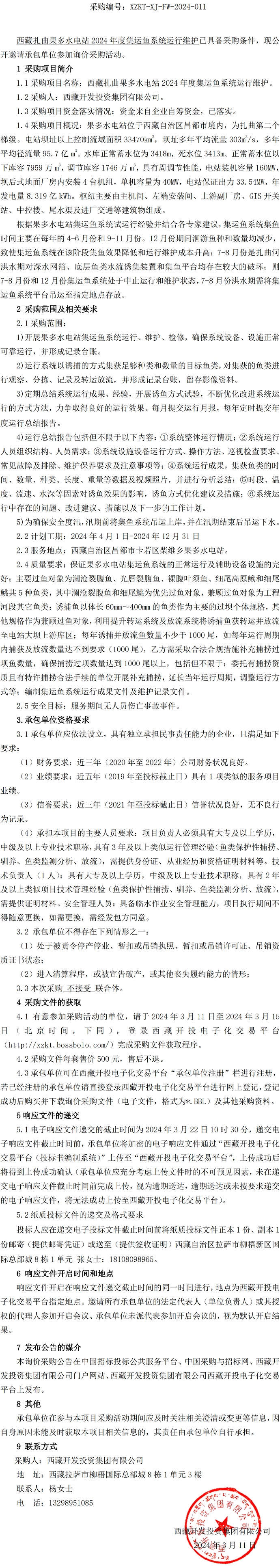 西藏扎曲果多水電站 2024 年度集運(yùn)魚系統(tǒng)運(yùn)行維護(hù)詢價(jià)采購公告