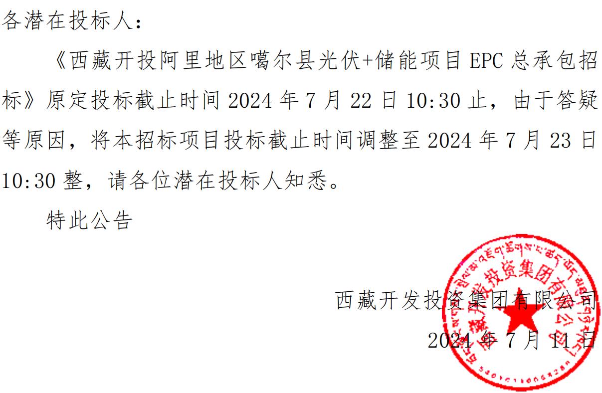 關(guān)于延長《西藏開投阿里地區(qū)噶爾縣光伏+儲能項目EPC總承包招標(biāo)》投標(biāo)截止時間的公告