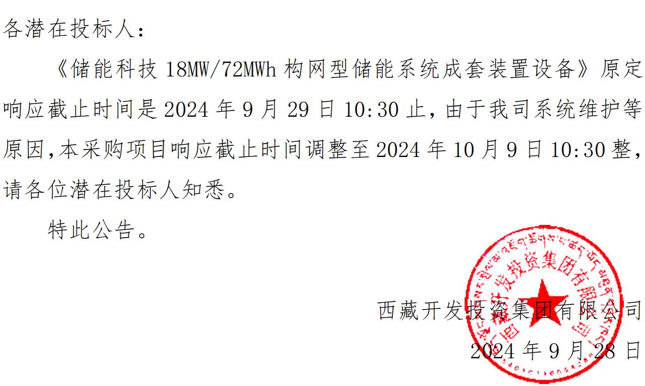關(guān)于延長《儲能科技 18MW/72MWh 構(gòu)網(wǎng)型儲能系統(tǒng)成套裝置設(shè)備》競爭性談判采購響應(yīng)截止時間的公告