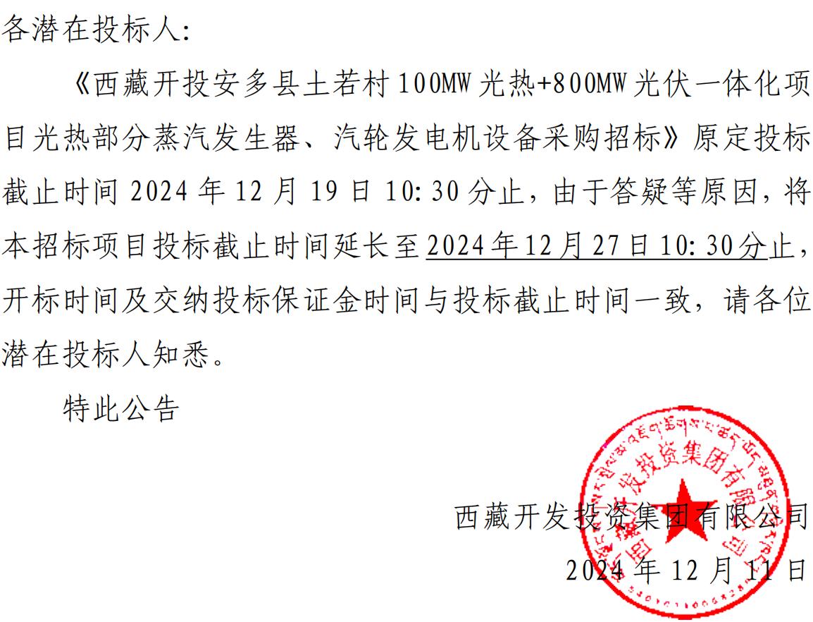關(guān)于延長《西藏開投安多縣土碩 100MW 光熱+800MW 光伏一 體化項目光熱部分蒸汽發(fā)生器、汽輪發(fā)電機設(shè)備采購招標(biāo)》投 標(biāo)截止時間的公告