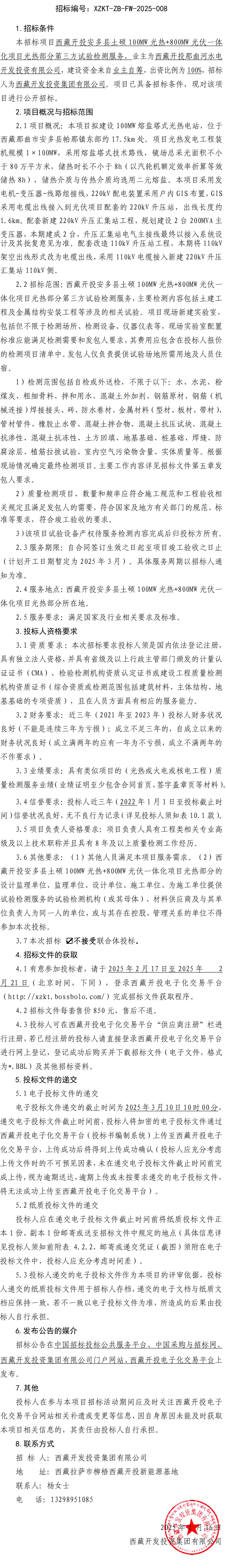 西藏開投安多縣土碩100MW光熱+800MW 光伏一體化項(xiàng)目光熱部分第三方試驗(yàn)檢測(cè)服務(wù)招標(biāo)公告