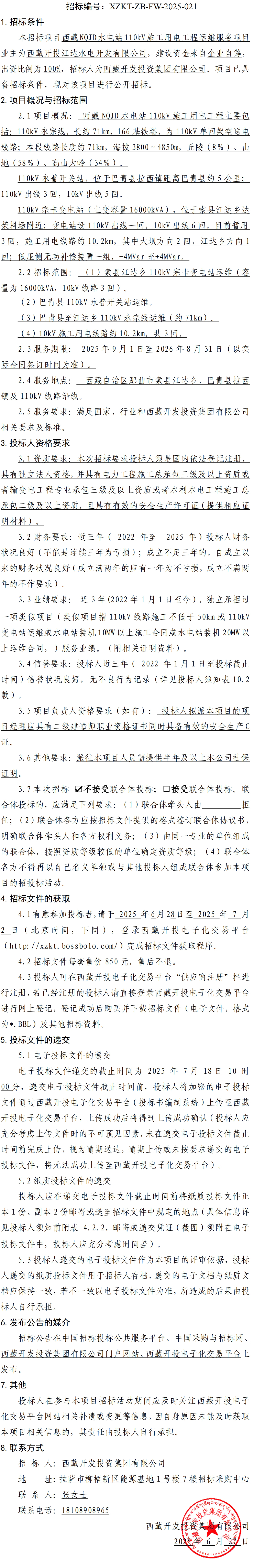 西藏NQJD水電站110kV施工用電工程運維服務(wù)招標公告