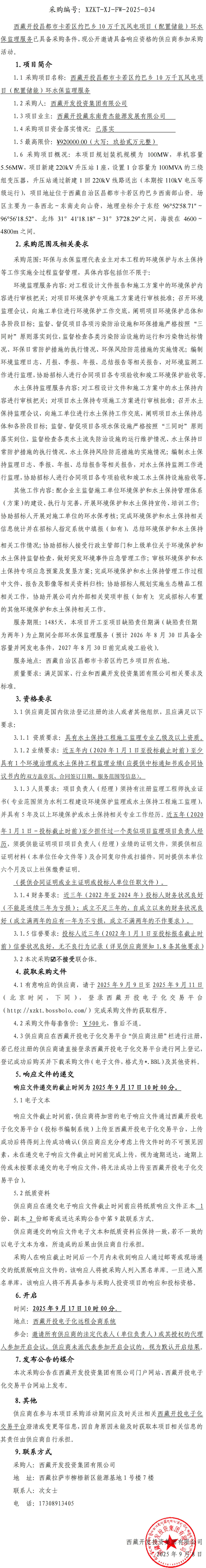 西藏開投昌都市卡若區(qū)約巴鄉(xiāng)10萬千瓦風電項目(配置儲能)環(huán)水保監(jiān)理服務詢比采購公告